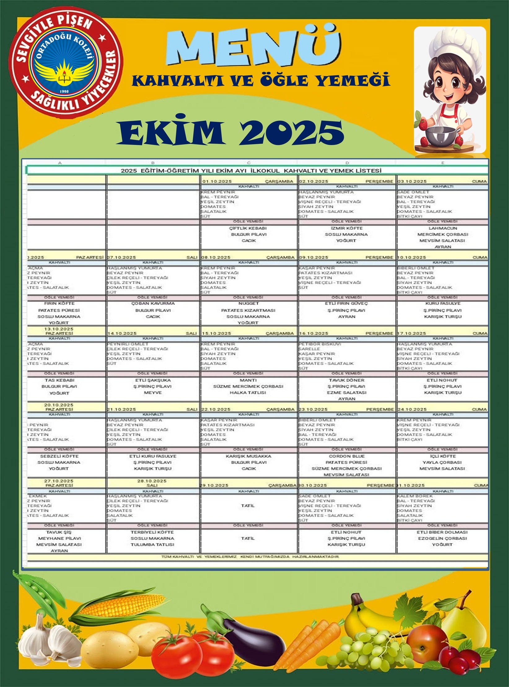 EKİM AYI İLKOKUL KAHVALTI, VE ÖĞLE YEMEĞİ LİSTESİ