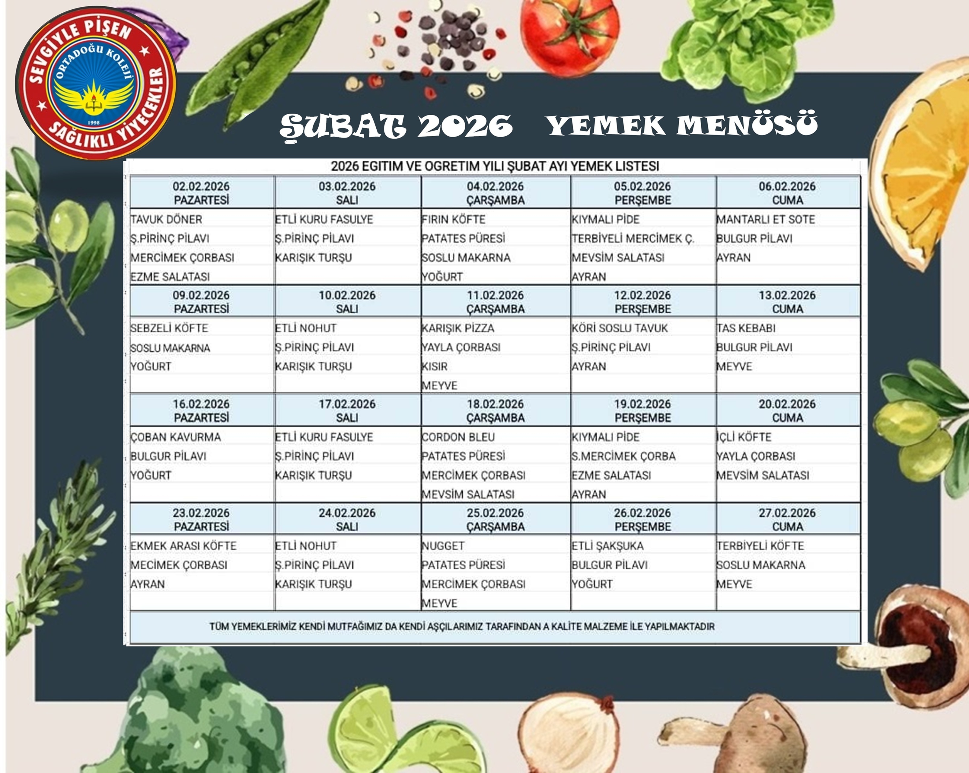 ŞUBAT AYI ORTAOKUL YEMEK LİSTESİ